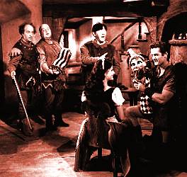 On the day of her 17th birthday, Snow White's father died, and the Queen immediately imprisoned her. Eventually, the Queen's jealousy of her stepdaughter became so great, that she ordered her killed. Snow White escaped her hired assassin, and found refuge in the empty cottage of the seven dwarfs, soon to be joined by "Ye Stooges Three" who are traveling to the castle with their ward. But the boy they have raised since childhood (also narrowly escaping an assassination attempt by the wicked Queen} is in reality Prince Charming, who, though he has lost his memory, is actually betrothed to Snow